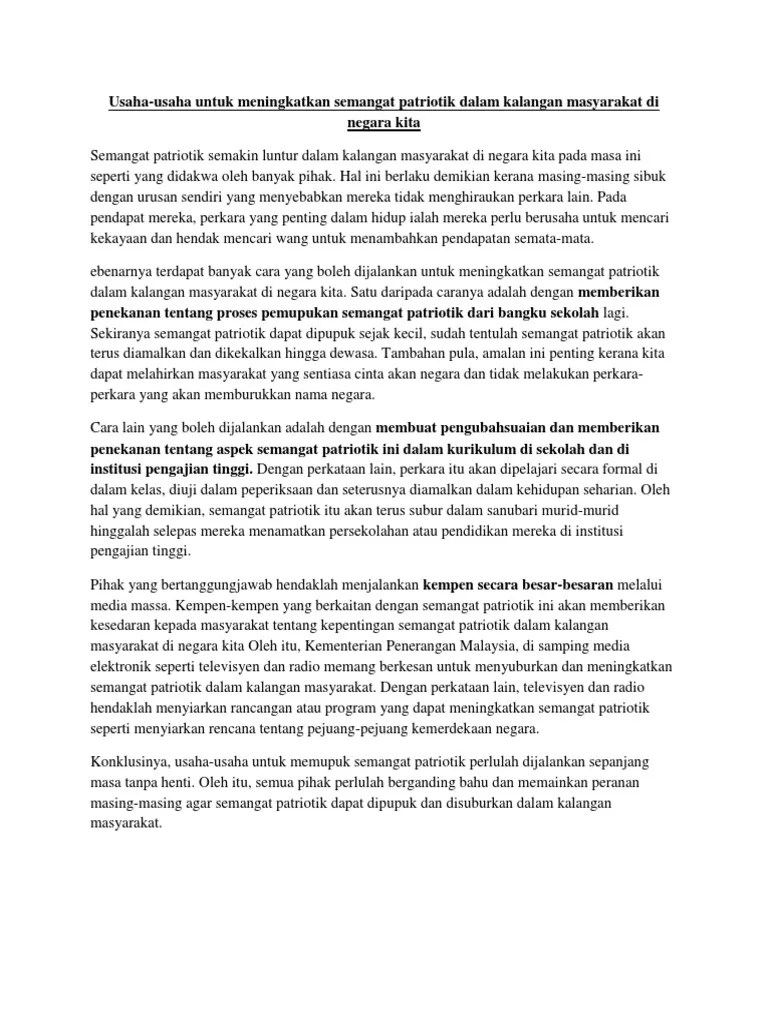 Sebenarnya terdapat banyak cara yang boleh dijalankan untuk meningkatkan semangat patriotik dalam kalangan masyarakat di negara kita. Pelbagai cara untuk memupuk semangat . Karangan cara cara menunjukkan rasa cinta akan negara spm. Sebenarnya terdapat banyak cara yang boleh dilakukan untuk meningkatkan semangat patriotik dalam kalangan masyarakat di negara kita terutama para remaja. Semangat cinta akan negara merupakan antara tajuk soalan yang popular untuk . Akan negara dan pemimpin yang berwibawa untuk masa yang akan datang. Sebenarnya terdapat banyak cara yang boleh dijalankan untuk meningkatkan semangat patriotik dalam kalangan masyarakat di negara kita. Penerapan nilai semangat patriotisme dalam diri. Tulis karangan cara memupuk semangat patriotisme. Individu juga memainkan peranan yang . Tamsilnya para pengajar juga boleh mengadakan ujian formal di . Pendahuluan patriotisme mengikut kamus dewan bahasa dan pustaka edisi empat 2007 menyatakan bahawa perasaan cinta yang kuat terhadap tanah air.